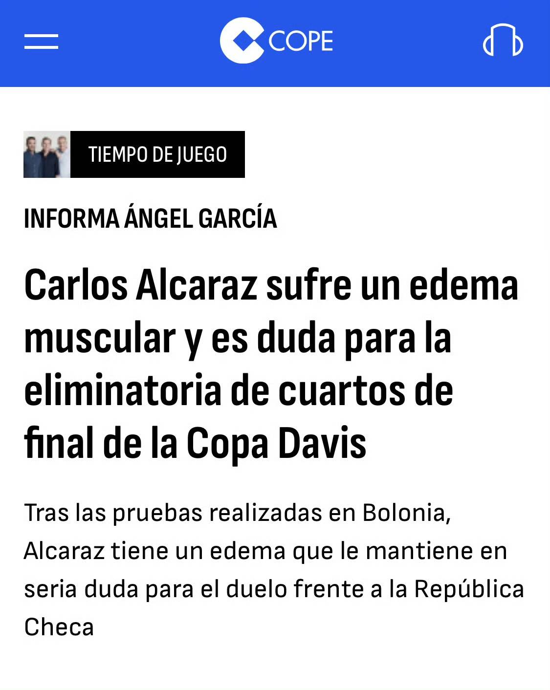 阿尔卡拉斯抵达博洛尼亚后,西班牙网球联合会医疗服务负责人安赫尔·鲁伊斯·科托罗为他安排了MRI检查。核磁共振结果显示肌肉水肿,这种损伤若不加注意,极易发展为肌肉撕裂。医疗团队给出了明确建议:退出戴维斯杯。
