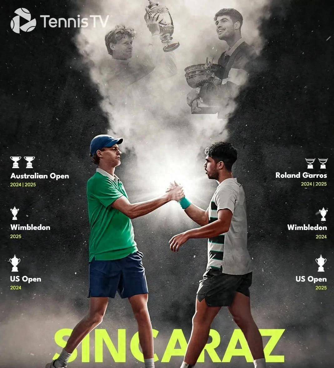 这场年终第一之争的背景是两人今年在大满贯赛场的交替称霸。 2024年澳网和美网、以及2025年的澳网和温网由辛纳夺冠;而2024年的法网和温网、以及2025年的法网和美网则由阿尔卡拉斯登顶。