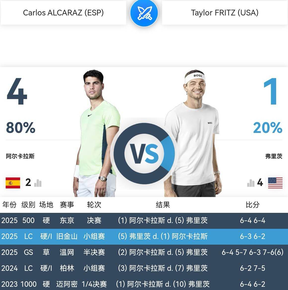生于1997年、身高1米96的弗里茨,发球势大力沉,正手进攻火力凶猛,反手进攻和切削近几年得到显著提升,实在是一名竞争力非常突出的选手。2022年印第安维尔斯大师赛决赛,弗里茨两盘战胜西班牙战神纳达尔,夺取职业生涯第一个大师赛冠军;2024年美网,弗里茨职业生涯首次闯进大满贯决赛,荣获亚军。职业生涯至今,阿尔卡拉斯和弗里茨交锋五次,取得了四胜一负的佳绩,殊为不易。