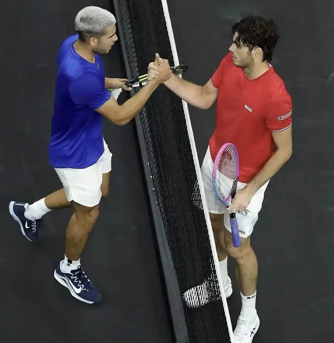 不过,弗里茨也就是这么说说而已,真要上场迎战阿尔卡拉斯,还是毫不含糊,敢打敢拼。这不,阿尔卡拉斯刚在2025年9月美网夺冠、重返世界第一,两人就在同月的拉沃尔杯表演赛上遭遇。面对新任世界第一阿尔卡拉斯,弗里茨毫不畏惧,6:3 6:2,干净利落地两盘完胜阿尔卡拉斯,为世界队最后夺取拉沃尔杯冠军立下汗马功劳。