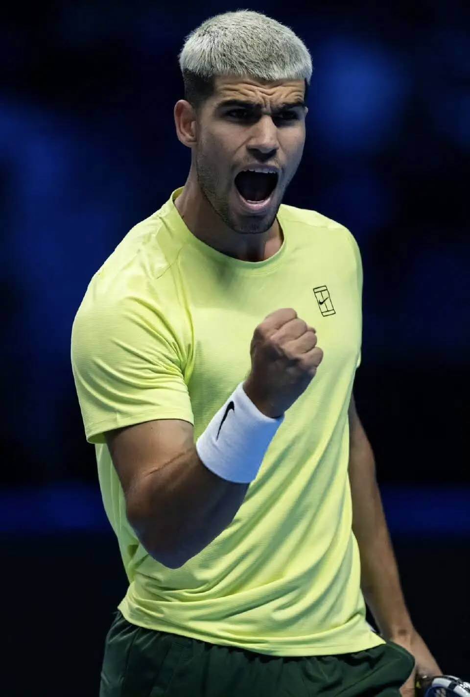 前天晚上小组赛首轮比赛,阿尔卡拉斯鏖战1小时40分钟,两盘战胜了七号种子、澳大利亚小野兔德-米纳尔。这是阿尔卡拉斯从2023年起连续三次参加年终总决赛,首次在小组赛第一场比赛取得胜利。如果没有观看这场比赛,很容易被7:6 6:2的比分所迷惑,以为阿尔卡拉斯状态大好,两盘完胜对手。其实阿尔卡拉斯在比赛中起伏很大,非受迫性失误达到28个。特别是第一盘,阿尔卡拉斯非受迫性失误高达惊人的19个,非常辣眼睛,以致第一盘抢七的时候,阿尔卡拉斯以4:5落后,并且面临德-米纳尔的两个发球分。好在阿尔卡拉斯临危不乱,连得三分,反以7:5的小分拿下了第一盘抢七。