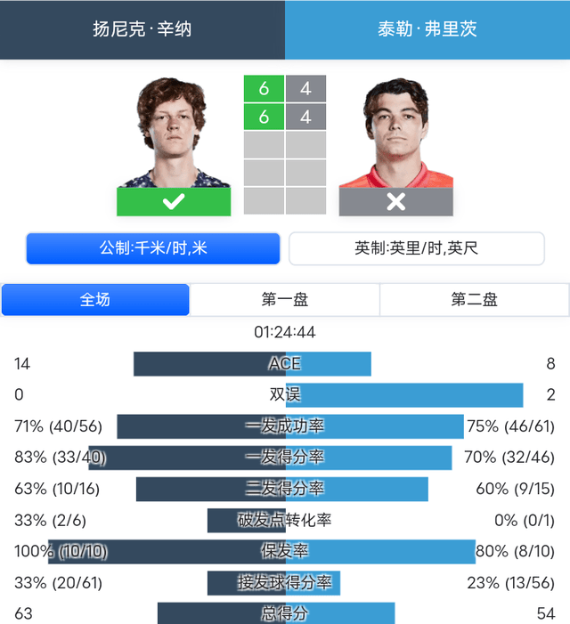 决赛首盘,弗里茨先发制人,辛纳三次追平比分,最终以6-4赢得首盘。第二盘,辛纳在两度落后情况下强势反弹,最终再次以6-4锁定胜局,最终以6-4、6-4战胜弗里茨,夺得总决赛冠军。