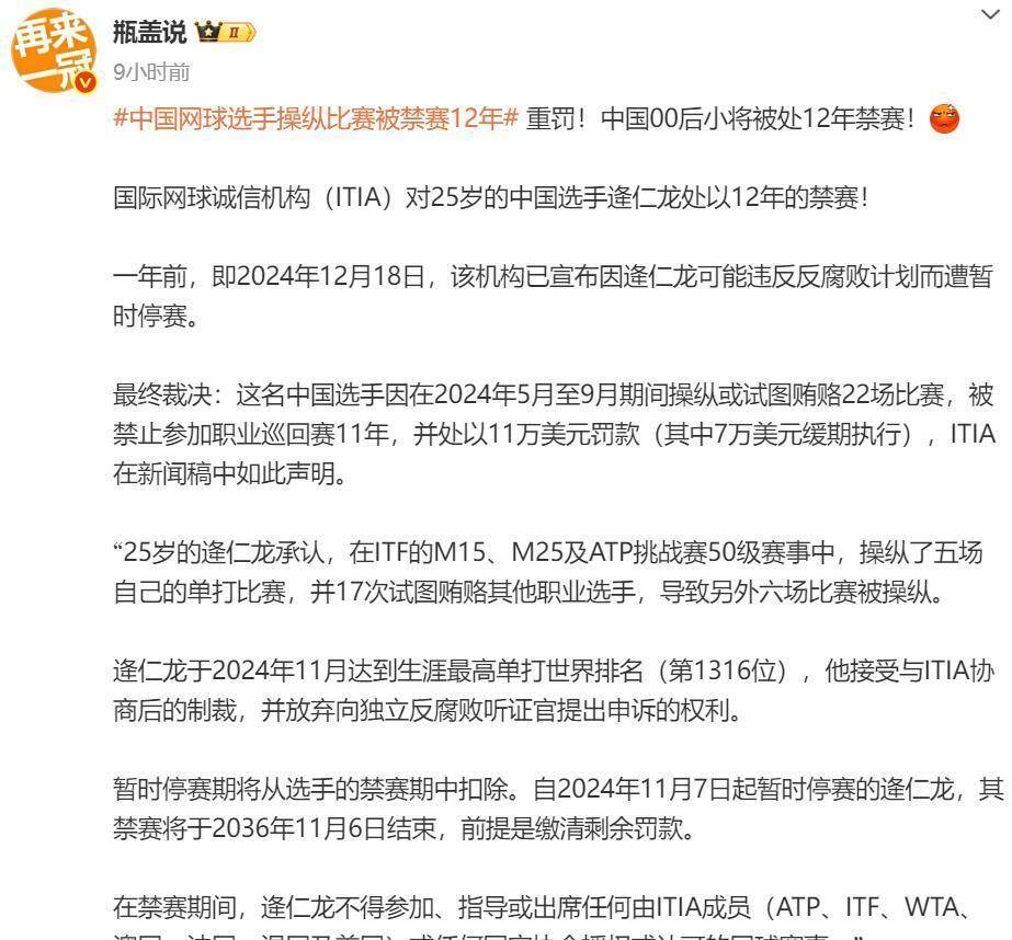2025年12月20日,国际网球诚信机构的一纸罚单,给他的职业生涯提前判了“死刑”:禁赛12年,罚款11万美元。